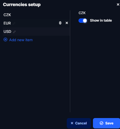 - On the left side, you will see all added currencies (e.g., CZK, EUR, USD).