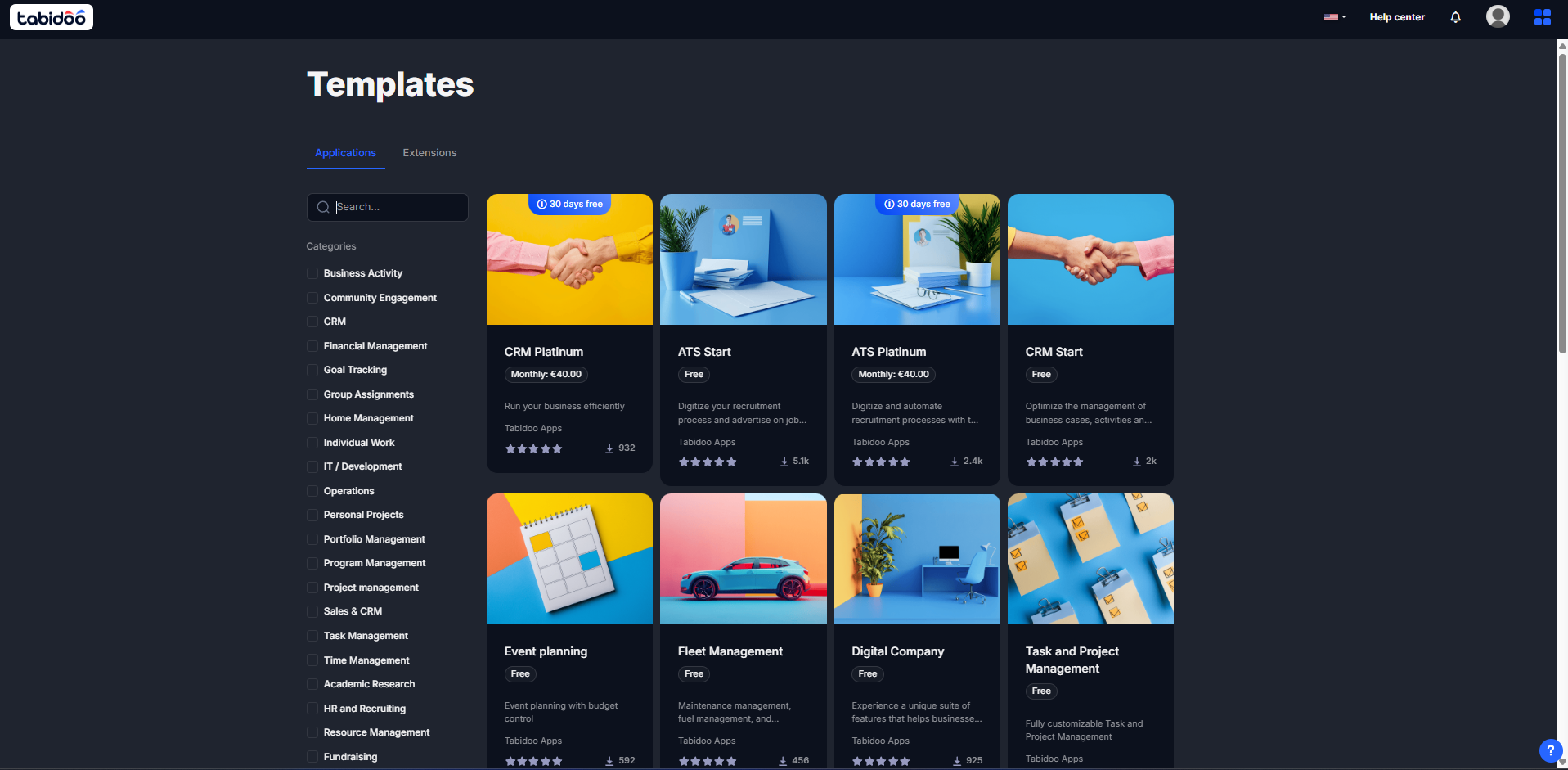 Applications are the cornerstone of Tabidoo. Each application can contain one or more tables, similar to what you may know from Excel. Applications allow you to organize data into logical units (e.g., CRM, HR, ATS).