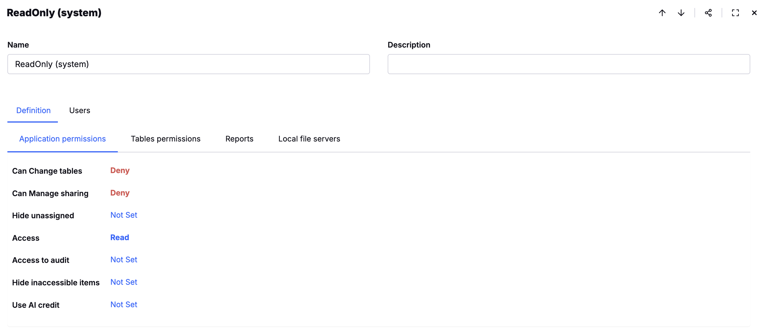 - Access to audit - if the user can view the audit log (history of changes) in the table (if the Audit option appears in the table).